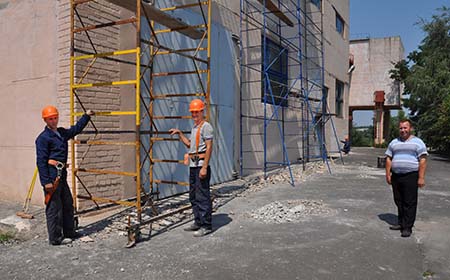 На фото: Ремонтная бригада работников РСУ: Евгений Капустин, Леонид Юзчишин и Андрей Гетьман, выполняют ремонт фасада надшахтного здания 3-Бис. Общее руководство по объекту осуществляет зам. начальника строительного участка №1 - Иван Варшавец.
